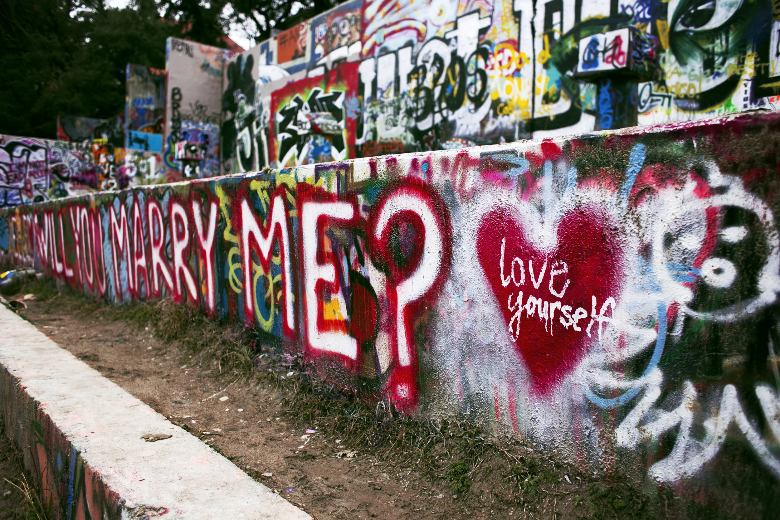 Nice place to chill and people watch. A place where the walls are constantly changing with different artwork and messages. This one was my favorite. Makes me wonder if someone proposed here recently...