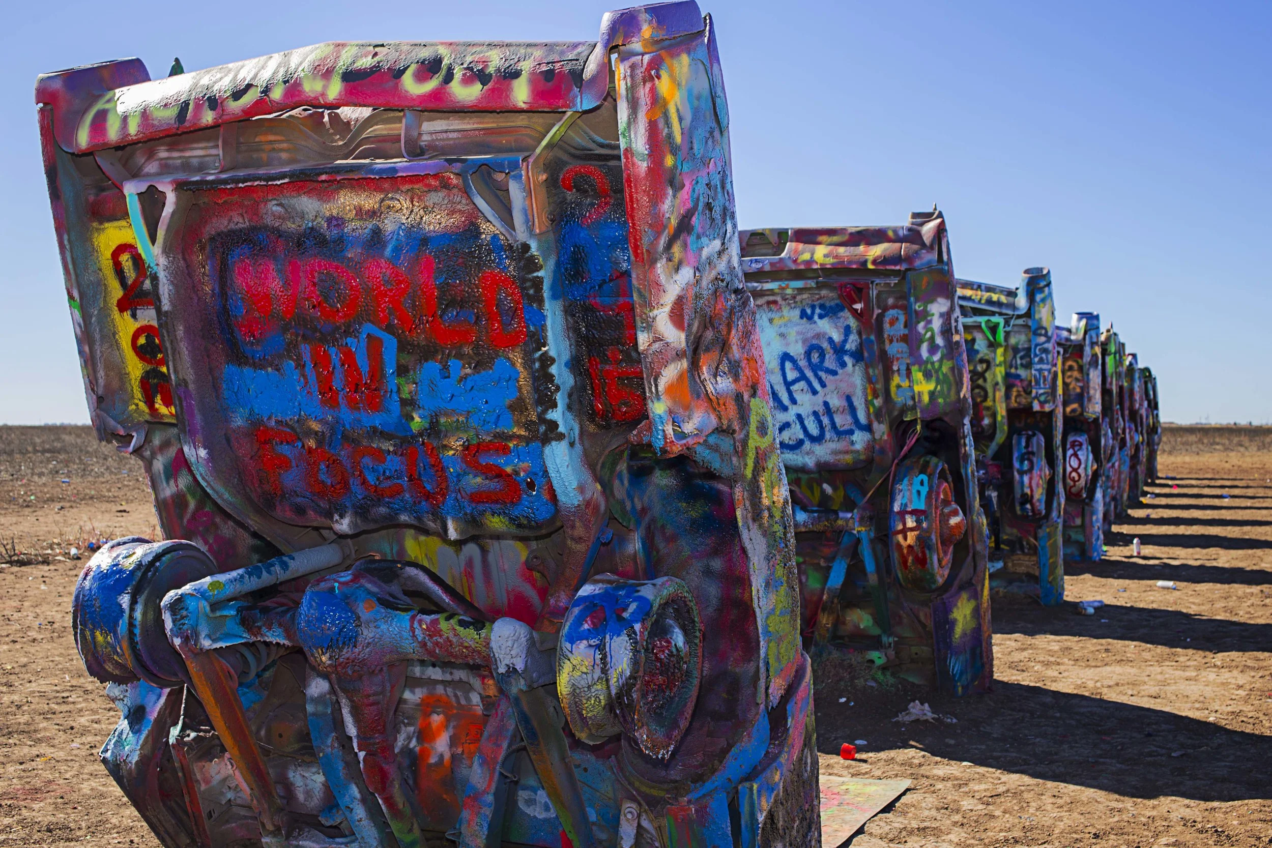 We couldn't pass up a chance to stop by Cadillac Ranch on our way to Santa Fe, NM. Here you will find literally old Cadillacs buried into the ground where you are encouraged to express yourself. Don't mind if we do!