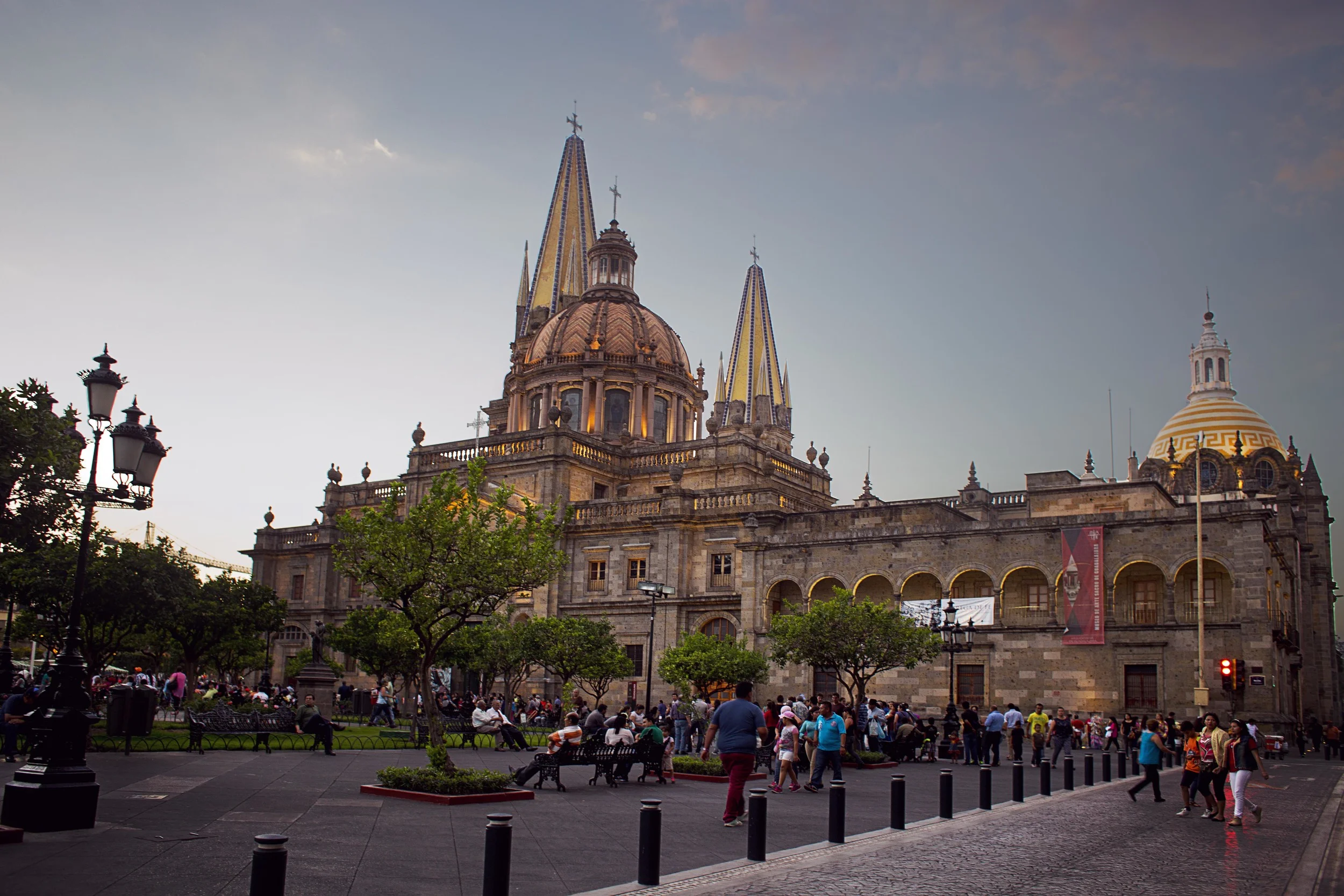 A beautiful evening in the historic center of Puebla where you can admire the tile-work used on the buildings unique to Puebla complimented by its a bright evening blue sky.
