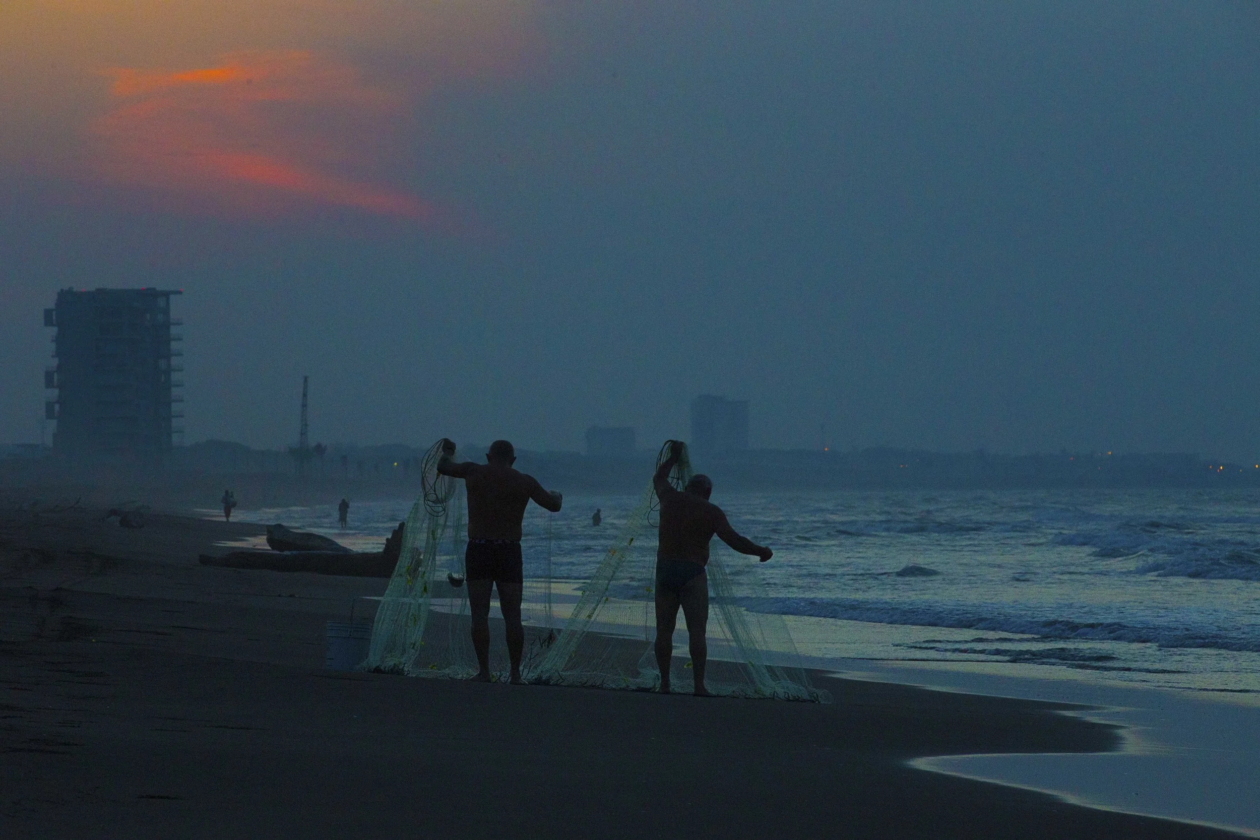 Evening fishermen getting their nets ready to catch the fish that come up to the edge of the shore to eat the small mollusks and seashells. As the tide comes up, the more fish they can catch. The fishermen walk several kilometers and then back to their car every night to catch as many fish as they can.