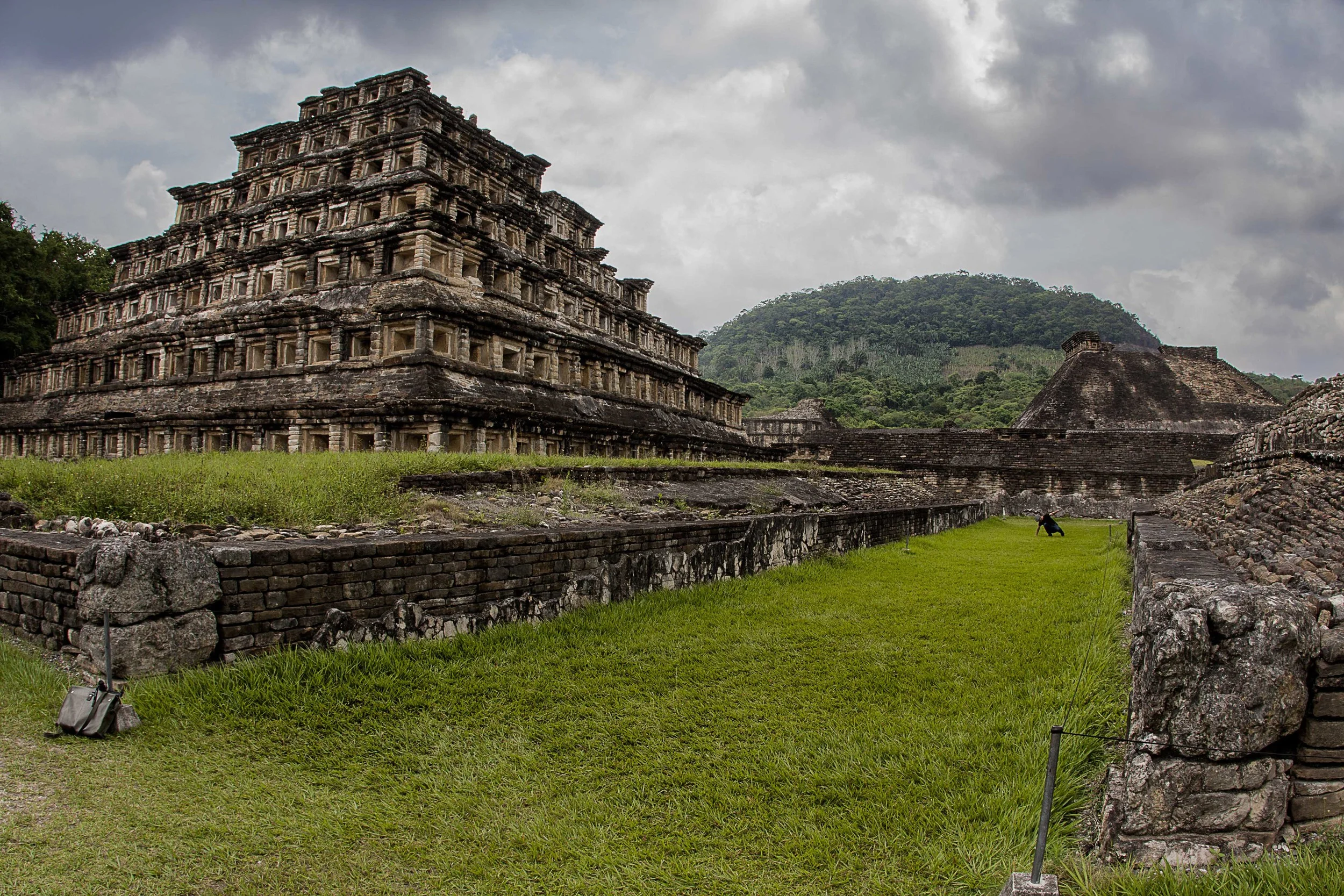 Next to Papantla is the Totonec city of thunder, El Tajin, and true to it's name we arrive on a cloudy and thunderous day. The famous Templo de los Nichos has 365 niches representing a complete solar year. The temple is situated next to the ball court created for the elites where Vincent pretends to play poc ta poc. Behind it you see a hill covered with trees where another structure lays underneath.