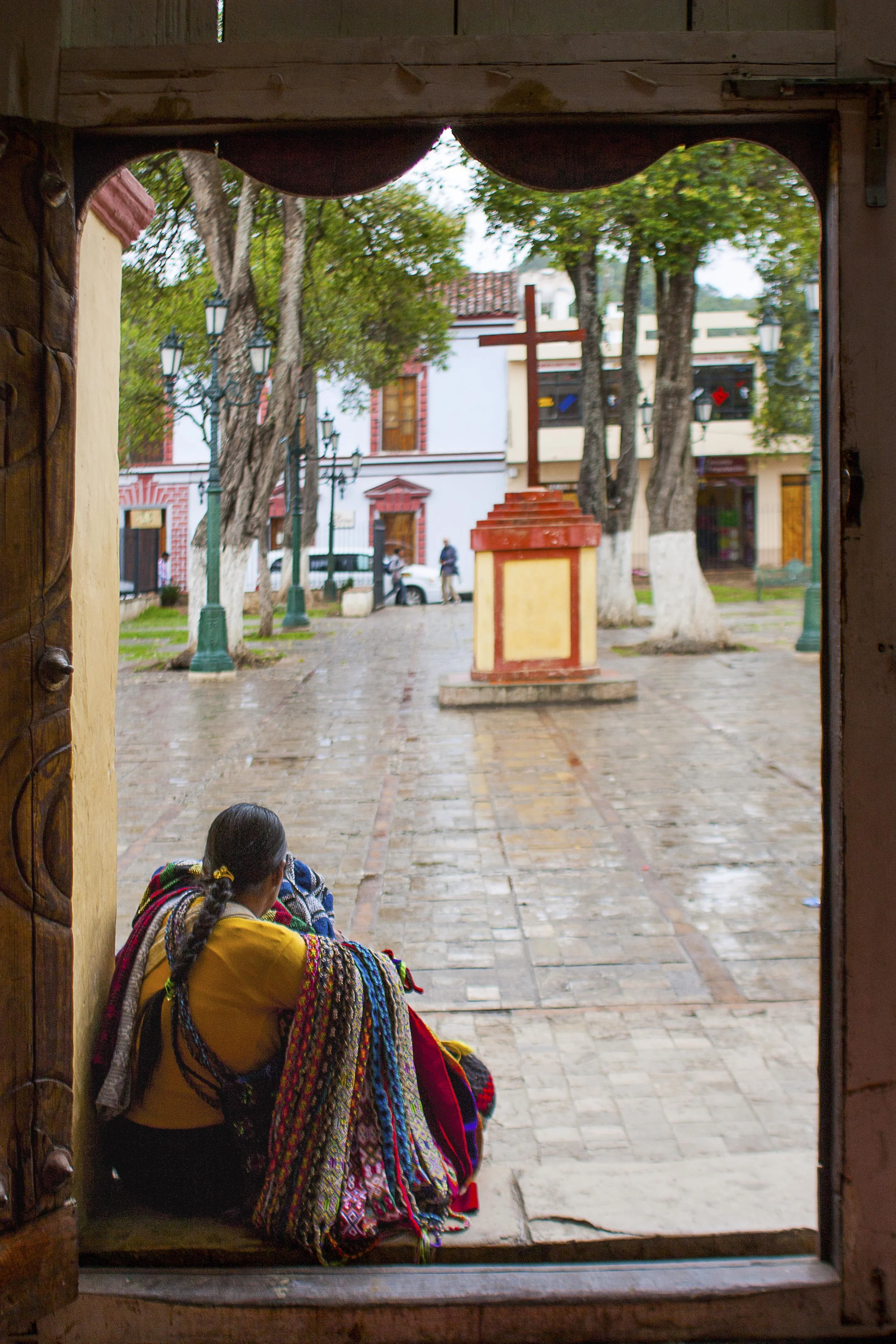We take a day off from tours and walk around the cobbled streets of San Cristobal to take it all in. It happened to rain so the usual hustle of the streets was missing. Here, a lady waits for the rain to stop at the steps of a church so she can go back to selling her crafts.